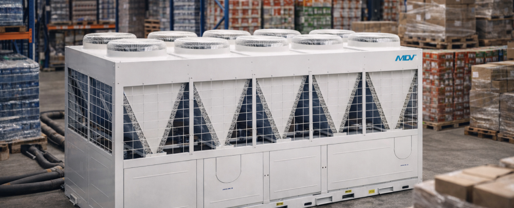 Системы MDV решают это за счет равномерного распределения воздуха и автоматического регулирования вентиляции. В результате температура поддерживается на всем складе, отклонения быстро компенсируются.